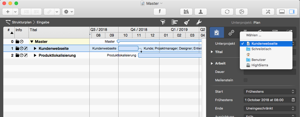 Hinweis: Um ein Unterprojekt direkt aus einem Master-Projekt zu öffnen, wählen Sie seine Reihe aus, und verwenden Sie den Inspektor, um dessen Pfad zu sehen. Sobald Sie die Maustaste los lassen, wird Merlin Project das einzelne Unterprojekt öffnen.