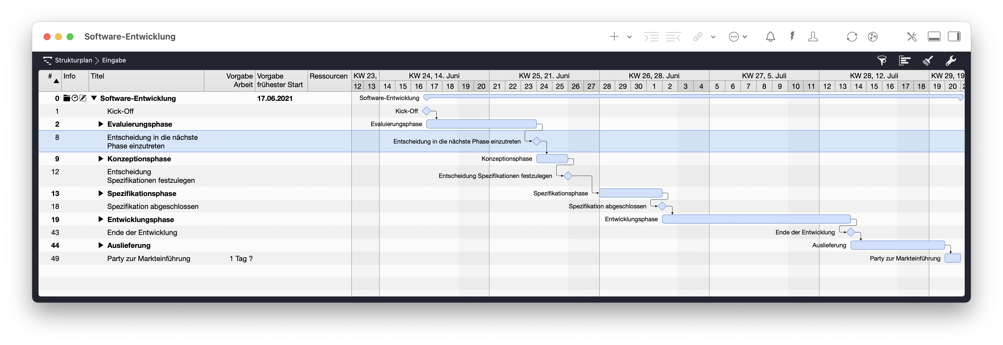 Mit Merlin Project ist es sogar möglich beide Ansätze, den traditionellen und den agilen gleichzeitig für das Projekt zu verwenden. Starten Sie agil. Einfacher als in der Kanban-Ansicht geht Projektmanagement nicht: Sammeln Sie Ihre Aufgaben in der linken Spalte als Karten. Im weiteren Verlauf des Projekts schieben Sie diese nach rechts, bis sie schlussendlich in der Erledigt-Spalte landen. Wenn Sie dabei die Ansicht zwischen der Kanban-Tafel und dem Strukturplan in Merlin Project umschalten, erleben Sie den magischen Effekt: Die Ganttbalken füllen sich automatisch. Das ist hybrides Projektmanagement.