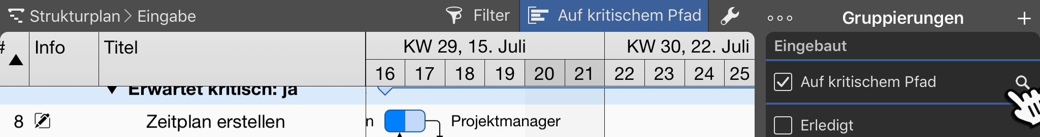 Balken im Gantt-Diagramm lassen sich mit einem Antippen aktivieren. Ein erneutes Antippen blendet das Kontextmenü ein.