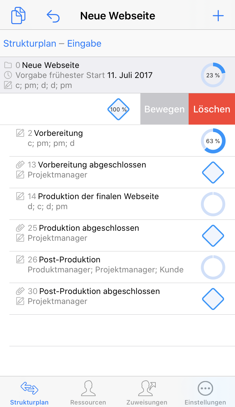 Im Strukturplan, Ressourcen oder Zuweisungen wischen Sie nach links und tippen Sie auf "Löschen" zum Löschen des Objekts.