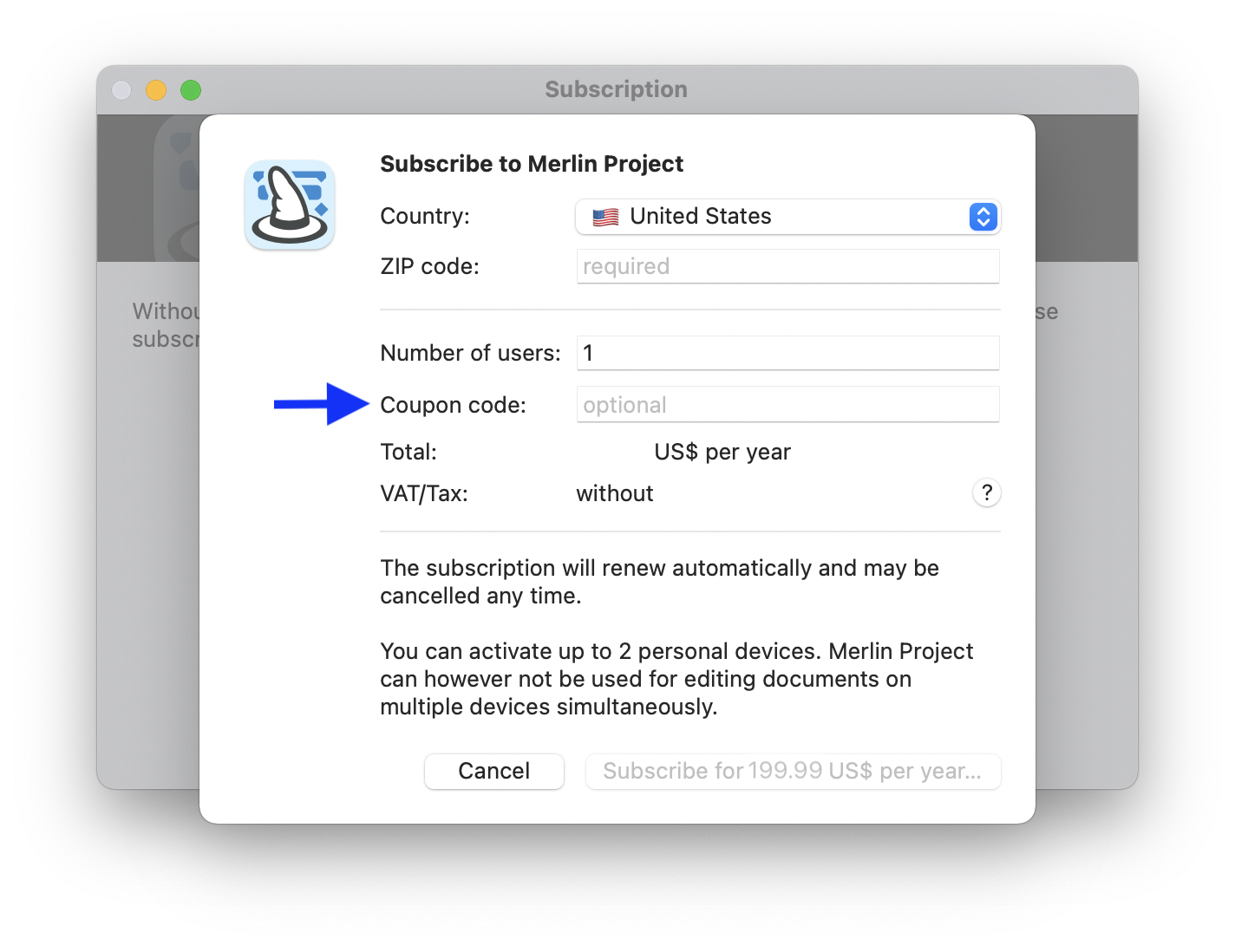 A coupon code offers you a special discount, reducing the subscription price for Merlin Project. Follow these steps to redeem your coupon code: