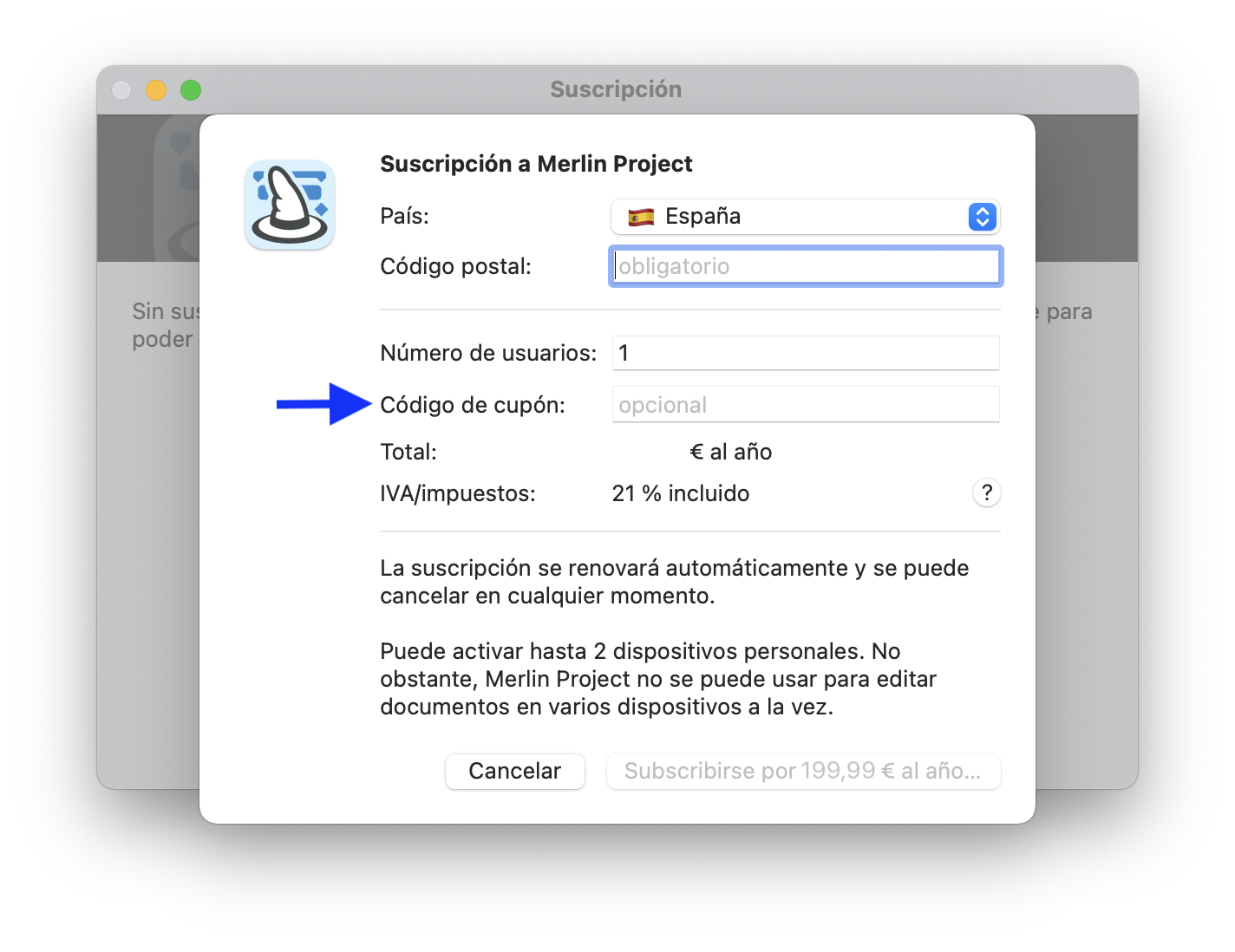 Un código de descuento le ofrece una reducción especial, bajando el precio de la suscripción para Merlin Project. Siga estos pasos para canjear su código de descuento: