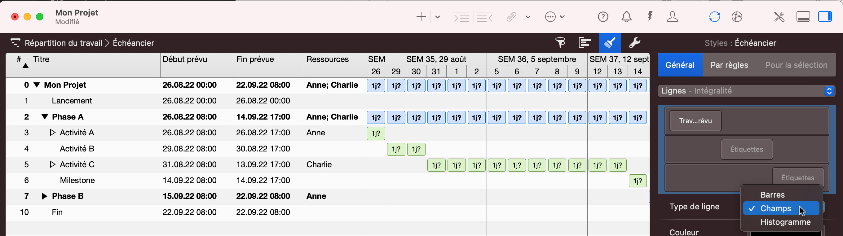 REMARQUE : Une vue avec des barres de Gantt exportera les valeurs du contour. Si vous avez besoin d'exporter des informations échelonnées dans le temps, vous pouvez changer le Type de ligne en 'Champs'.