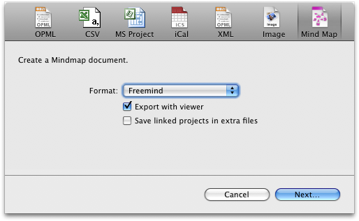 You can export your project file as a mind map using the Mind Map - Freemind option. All you need to view your mind map is a web browser. This is a great way of sending your Merlin Project file mindmap to other users even if they don't have mind mapping software.