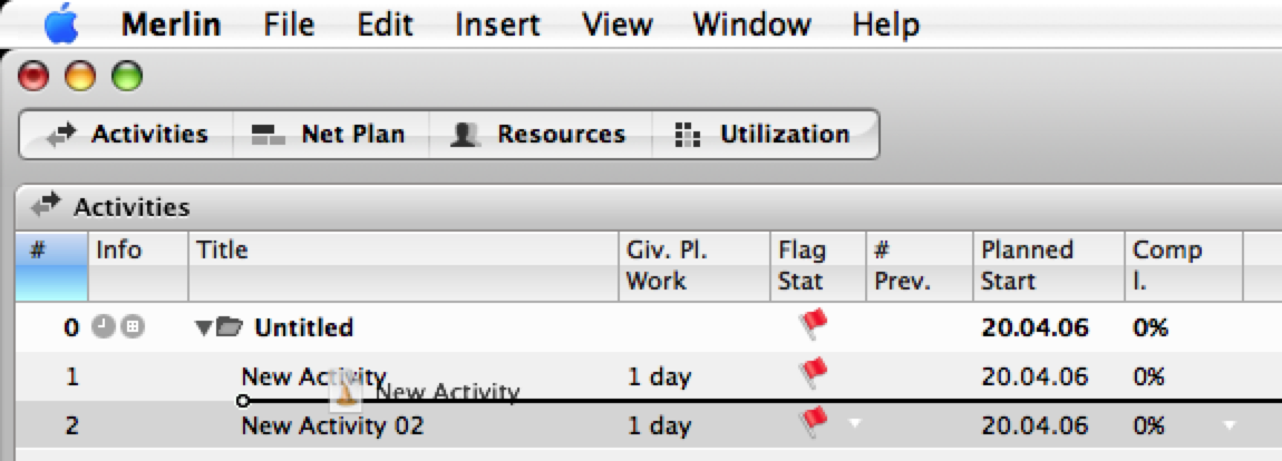 To allocate a resource to an activity, drag the address directly onto the relevant activity. If this address is not already contained within the project, Merlin will add this automatically as a resource in the resource list.