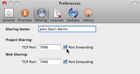 Over the WAN (i.e. Internet), you have to configure your firewall to forward outside connections to the machine that is sharing Merlin files. For convenience, Merlin provides you with a preference where you can enable port forwarding and determine the port number you wish Merlin to listen on. We recommend you use the default value.